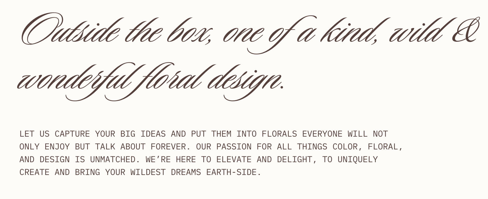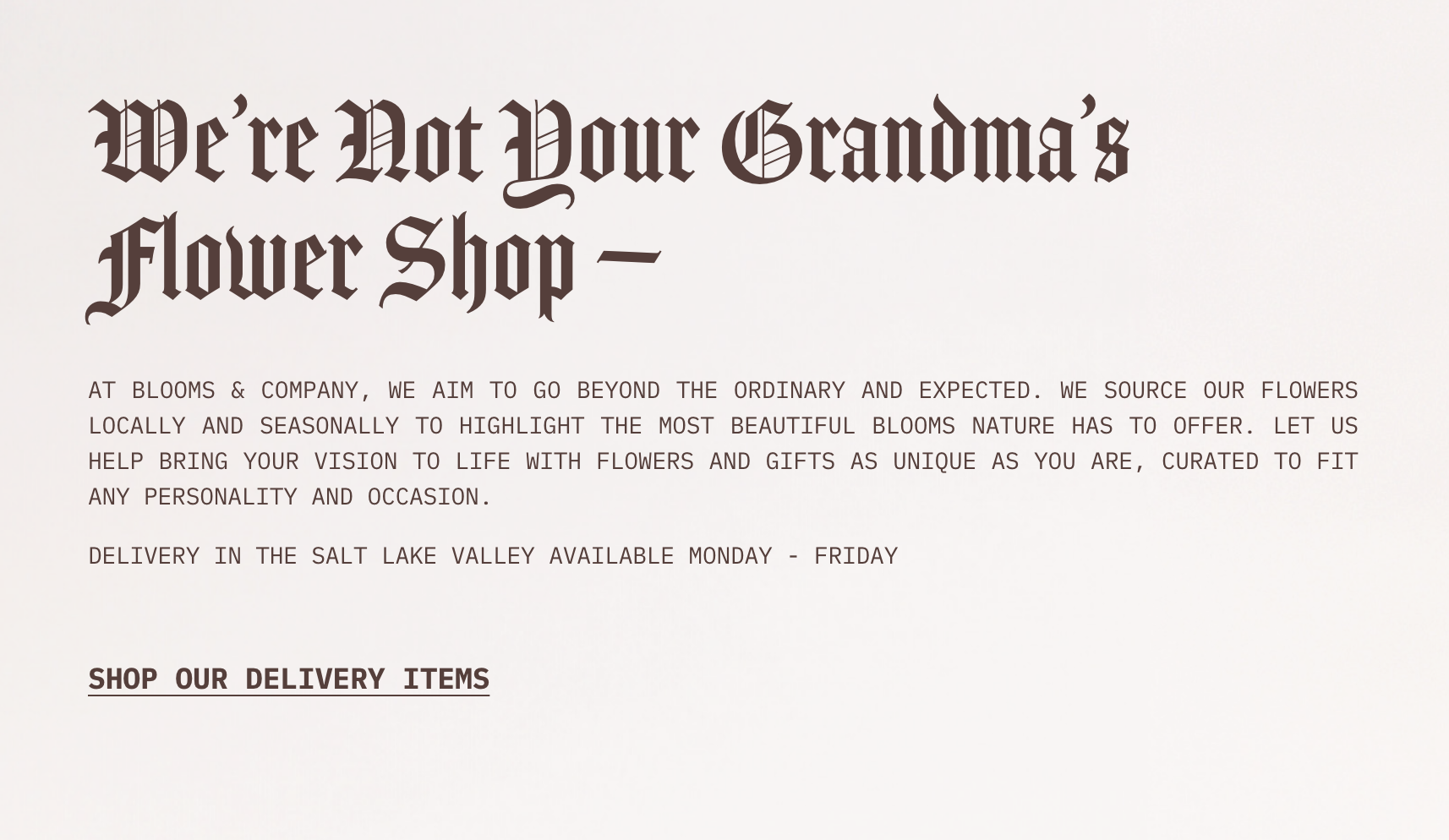 Blooms & Company is a boutique floral and event company in Salt Lake City, Utah. They specialize in bringing artistic installations and arrangements to life with sculptural and architectural influences. Blooms & Company seeks to work outside the box and take flower arranging to the next level. They aim to go beyond the ordinary and expected. we source our flowers locally and seasonally to highlight the most beautiful blooms nature has to offer. let us help bring your vision to life with flowers and gifts as unique as you are, curated to fit any personality and occasion.